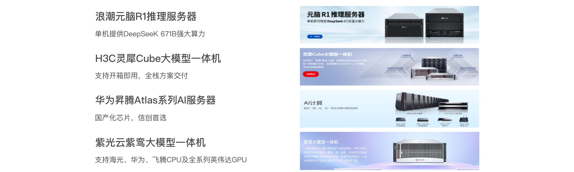 依托浪潮、華為、H3C、紫光云等頭部廠商授權(quán)代理合作,我們打造 “硬件 + 應(yīng)用” 全棧方案,涵蓋 DeepSeek 訓(xùn)推一體機(jī)等優(yōu)質(zhì)產(chǎn)品。