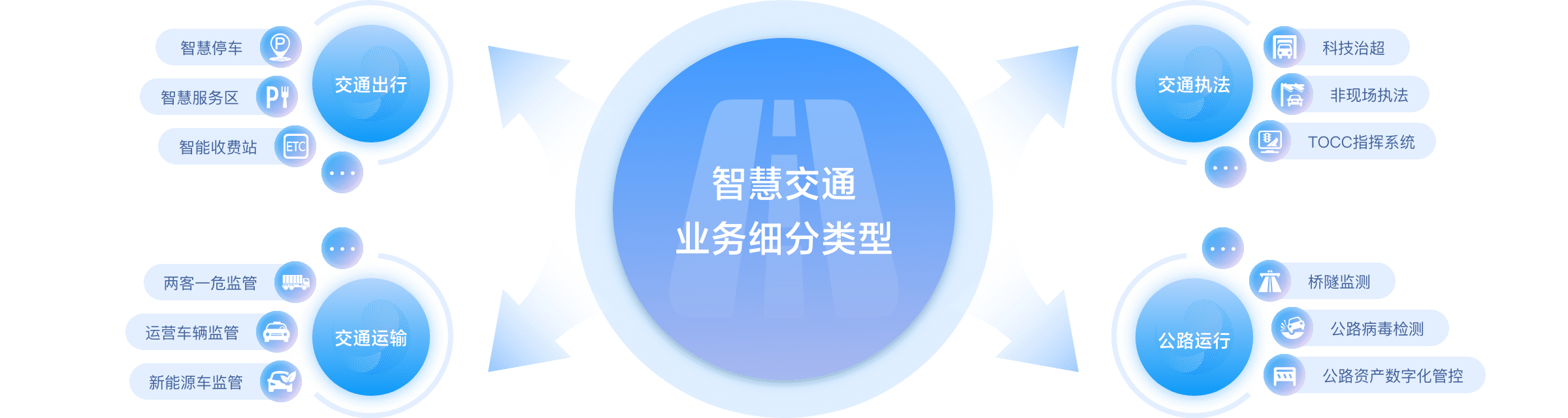 業(yè)務領域包含:交通出行、交通運輸、公路運行、交通執(zhí)法四個板塊組成。