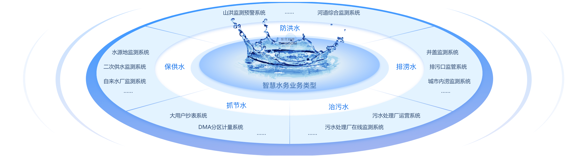 業務領域包含:保供水、抓節水、治污水、排澇水、防洪水五大環節,實現五水共治、智慧循環。