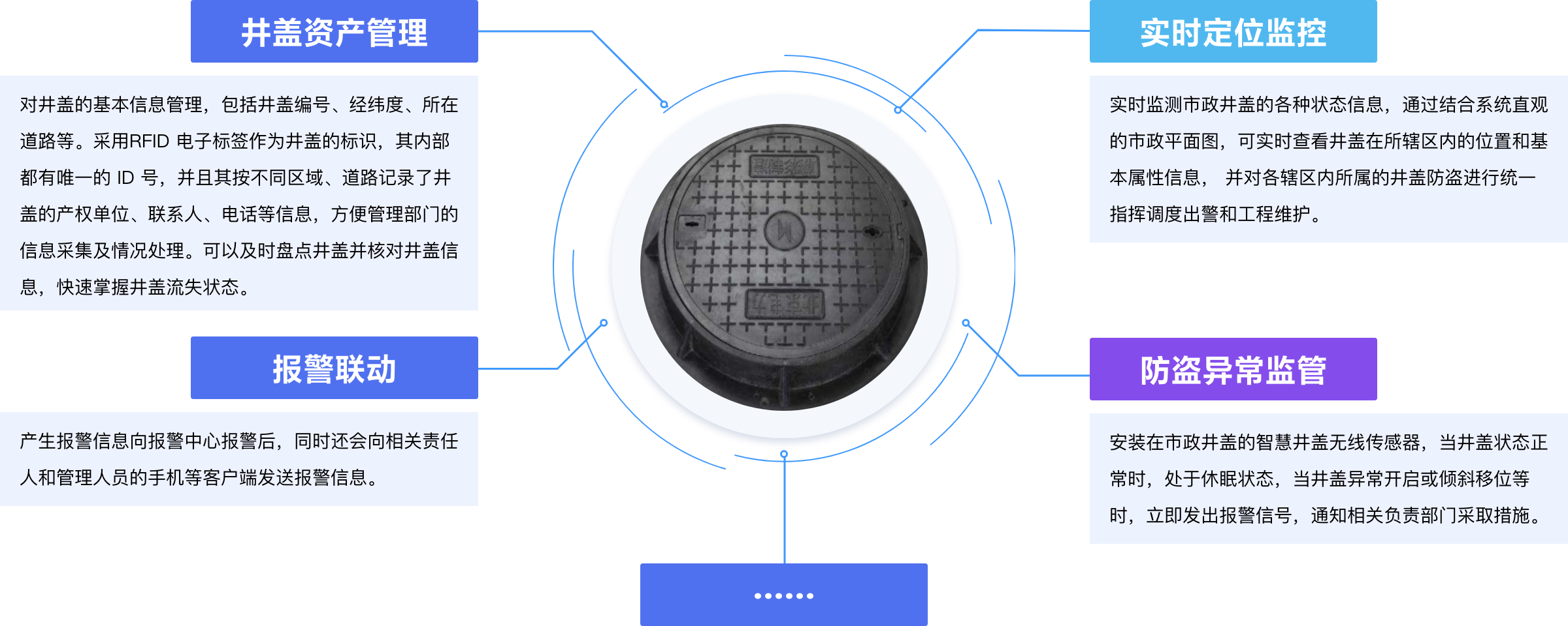 2013年,住建部頒發(fā)了《關于進一步加強城市窨井蓋安全管理的通知》,要求城市管理部門,試行井蓋的數(shù)字化管理。2021那年住建部等部委頒布了《關于加強窨井蓋安全管理的指導意見》,要求有條件的地區(qū)要將窨井蓋智能化升級改造,運用5G、人工智能、大數(shù)據(jù)、云計算等新技術,逐步實現(xiàn)基于傳感器和物聯(lián)網(wǎng)的管理創(chuàng)新,提升窨井蓋安全管理效率和水平。 本方案采用創(chuàng)新傳感器技術、GIS技術、計算機網(wǎng)絡技術、5G物聯(lián)網(wǎng)NB-IoT通訊技術等物聯(lián)網(wǎng)相關技術,實現(xiàn)城市井蓋和事件管理的智慧化、網(wǎng)絡化和空間可視化,創(chuàng)新井蓋管理模式,完善井蓋管理流程,建立一套科學完善的監(jiān)督監(jiān)管運行維護體系,提高井蓋綜合管理的效率和水平。井蓋監(jiān)測系統(tǒng)告警聯(lián)動,精確監(jiān)控水位報警,氣體報警,井蓋傾斜,井蓋丟失等事件。基于 LoRa 和 NB-IoT 技術的傳感設備,低功耗,信號穿透力強。 適用對象:市政管理部門。 解決的問題:安全報警、維修困難、數(shù)據(jù)缺失。 應用的價值:全面統(tǒng)籌井蓋資源;實現(xiàn)對井蓋的責任追溯監(jiān)管;熱點區(qū)域動態(tài)顯示,數(shù)據(jù)采集與分析;井蓋運營狀態(tài)實時顯示,進行精細化管理。